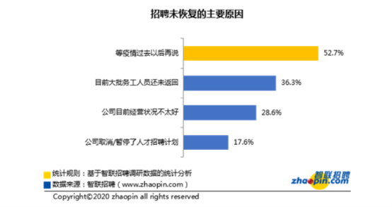 智联招聘最新调研数据显示,72%的企业表示复工后的招聘计划还未恢复正常水平。至于未恢复的原因,52.7%的企业明确表示“等疫情过去以后再说”,以时间换空间;36.3%的企业提到大批务工人员未返岗(包括负责招聘的人),因此无法正常开展招聘工作;28.6%的企业表示“公司目前经营状况不太好”,言下之意不需要招人;而17.6%的企业则直接公开说明公司已经取消或暂停招聘计划,以压缩人员成本渡过难关。