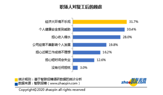 从智联招聘的调研数据可以看出,31.7%的职场人对经济大环境不乐观,30.4%的人担心个人健康安全受到威胁,28%担心收入缩水,19.8%担心公司经营不善影响个人发展,12.6%的上班族担心短时间会失业。