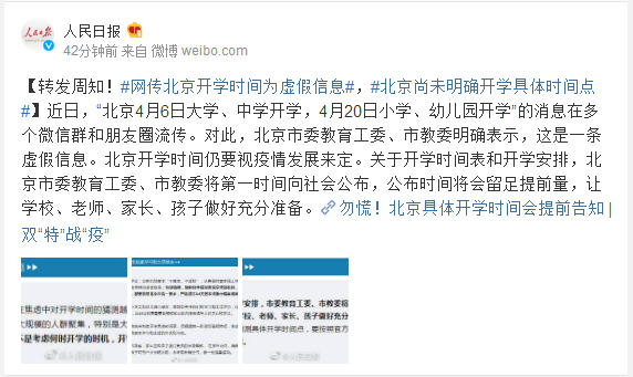 近日,“北京4月6日大学、中学开学,4月20日小学、幼儿园开学”的消息在多个微信群和朋友圈流传。对此,北京市委教育工委、市教委明确表示,这是一条虚假信息。北京开学时间仍要视疫情发展来定。关于开学时间表和开学安排,北京市委教育工委、市教委将第一时间向社会公布,公布时间将会留足提前量,让学校、老师、家长、孩子做好充分准备。