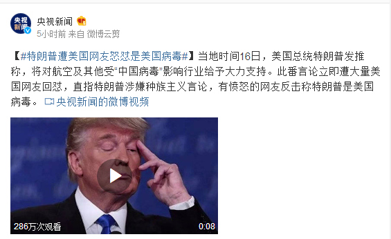当地时间16日,美国总统特朗普发推称,将对航空及其他受“中国病毒”影响行业给予大力支持。此番言论立即遭大量美国网友回怼,直指特朗普涉嫌种族主义言论,有愤怒的网友反击称特朗普是美国病毒。