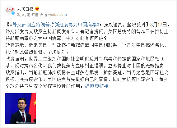 3月17日,外交部发言人耿爽主持新闻发布会。有记者提问,美国总统特朗普昨日在推特上将新冠病毒称之为中国病毒,中方对此有何回应?