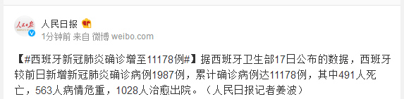 据西班牙卫生部17日公布的数据,西班牙较前日新增新冠肺炎确诊病例1987例,累计确诊病例达11178例,其中491人死亡,563人病情危重,1028人治愈出院。(人民日报记者姜波)