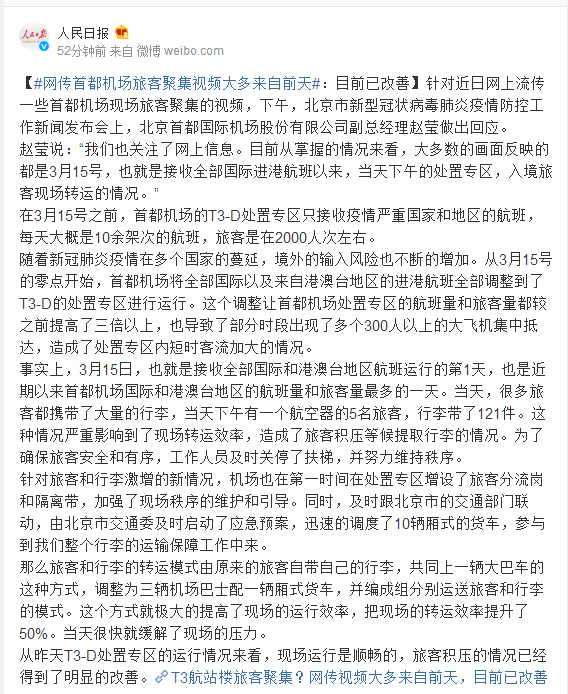 从昨天T3-D处置专区的运行情况来看,现场运行是顺畅的,旅客积压的情况已经得到了明显的改善。