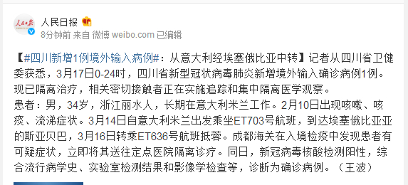 记者从四川省卫健委获悉,3月17日0-24时,四川省新型冠状病毒肺炎新增境外输入确诊病例1例。现已隔离治疗,相关密切接触者正在实施追踪和集中隔离医学观察。