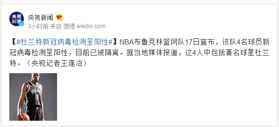 NBA布鲁克林篮网队17日宣布,该队4名球员新冠病毒检测呈阳性,目前已被隔离。据当地媒体报道,这4人中包括著名球星杜兰特。(央视记者王逢治)