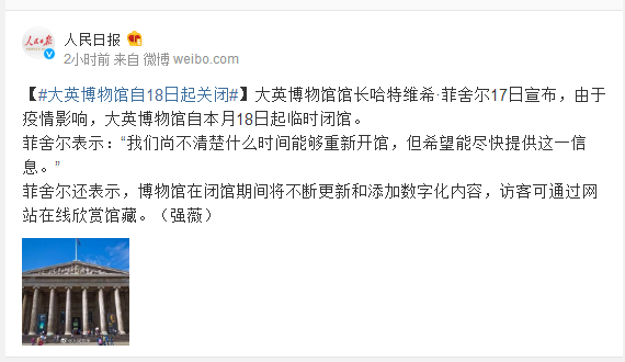 大英博物馆馆长哈特维希·菲舍尔17日宣布,由于疫情影响,大英博物馆自本月18日起临时闭馆。