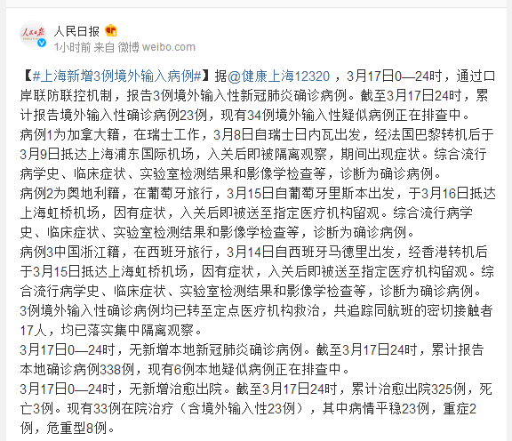 据@健康上海12320 ,3月17日0—24时,通过口岸联防联控机制,报告3例境外输入性新冠肺炎确诊病例。截至3月17日24时,累计报告境外输入性确诊病例23例,现有34例境外输入性疑似病例正在排查中。