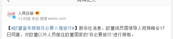 新华社消息,欧盟成员国领导人视频峰会17日同意,对欧盟以外人员前往欧盟国家的“非必要旅行”进行限制。