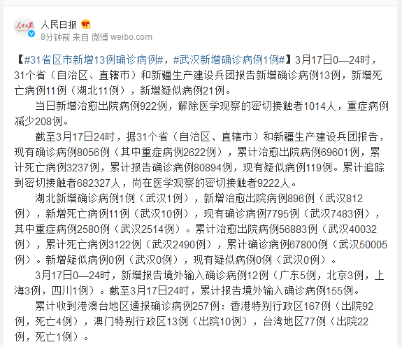 截至3月17日24时,据31个省(自治区、直辖市)和新疆生产建设兵团报告,现有确诊病例8056例(其中重症病例2622例),累计治愈出院病例69601例,累计死亡病例3237例,累计报告确诊病例80894例,现有疑似病例119例。累计追踪到密切接触者682327人,尚在医学观察的密切接触者9222人。