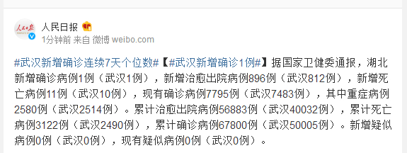 据国家卫健委通报,湖北新增确诊病例1例(武汉1例),新增治愈出院病例896例(武汉812例),新增死亡病例11例(武汉10例),现有确诊病例7795例(武汉7483例),其中重症病例2580例(武汉2514例)。累计治愈出院病例56883例(武汉40032例),累计死亡病例3122例(武汉2490例),累计确诊病例67800例(武汉50005例)。新增疑似病例0例(武汉0例),现有疑似病例0例(武汉0例)。