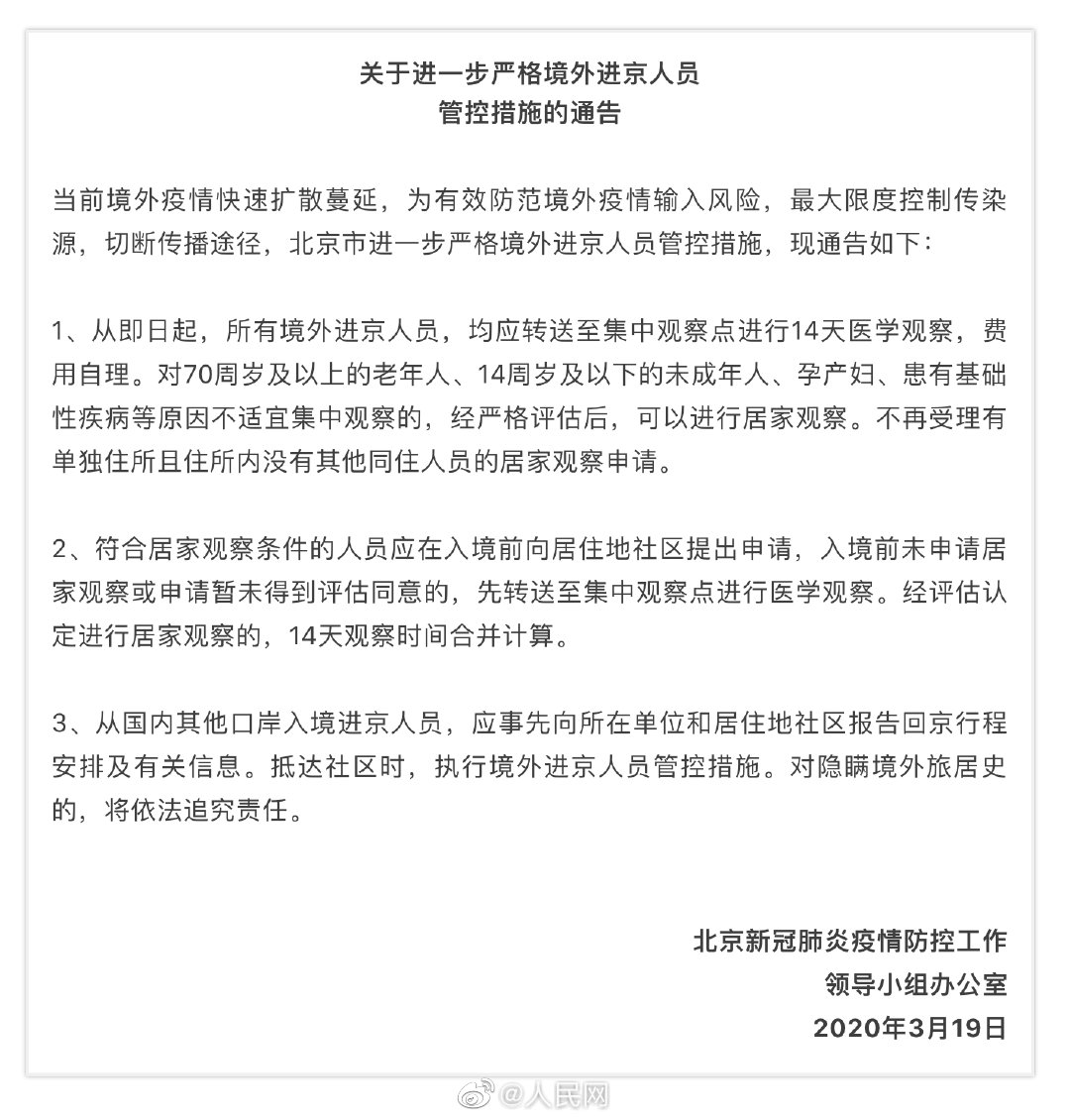 19日,北京发布《关于进一步严格境外进京人员管控措施的通告》,公布3条措施。