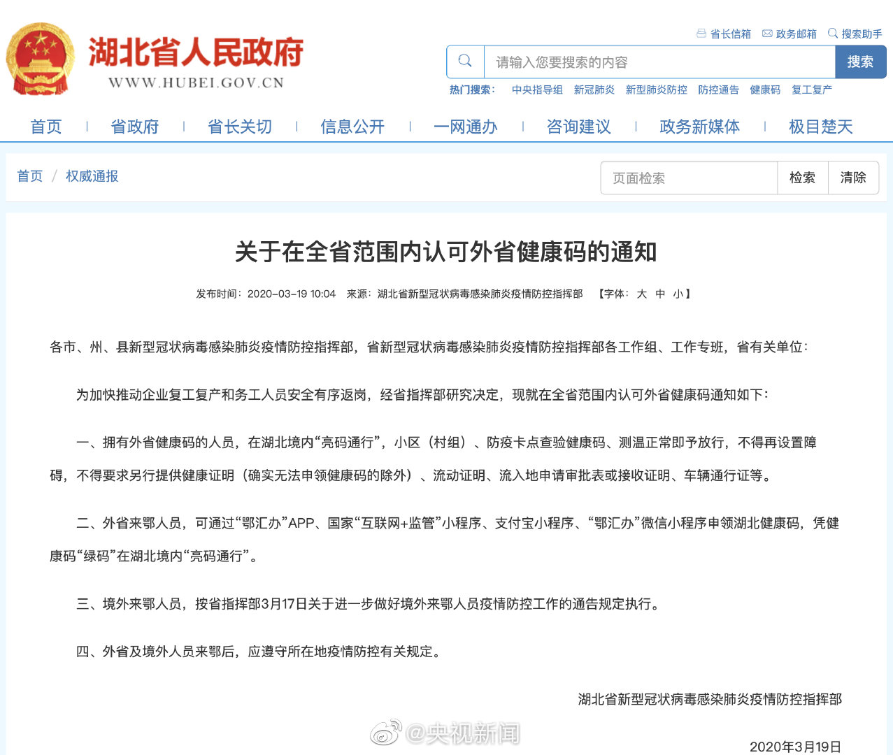 据湖北省新型冠状病毒感染肺炎疫情防控指挥部,拥有外省健康码的人员,在湖北境内“亮码通行”,小区(村组)、防疫卡点查验健康码、测温正常即予放行,不得再设置障碍,不得要求另行提供健康证明(确实无法申领健康码的除外)、流动证明、流入地申请审批表或接收证明、车辆通行证等。