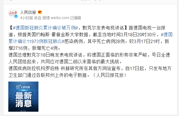 据德国电视一台报道,根据美国约翰斯·霍普金斯大学数据,截至当地时间3月18日20时30分,#德国累计确诊11973例新冠肺炎#感染病例,其中死亡病例28例。较3月17日21时,新增2716例,新增死亡4例。