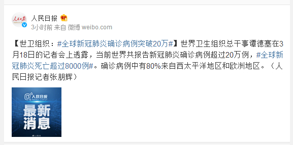 世界卫生组织总干事谭德塞在3月18日的记者会上透露,当前世界共报告新冠肺炎确诊病例超过20万例,#全球新冠肺炎死亡超过8000例#。确诊病例中有80%来自西太平洋地区和欧洲地区。(人民日报记者张朋辉)