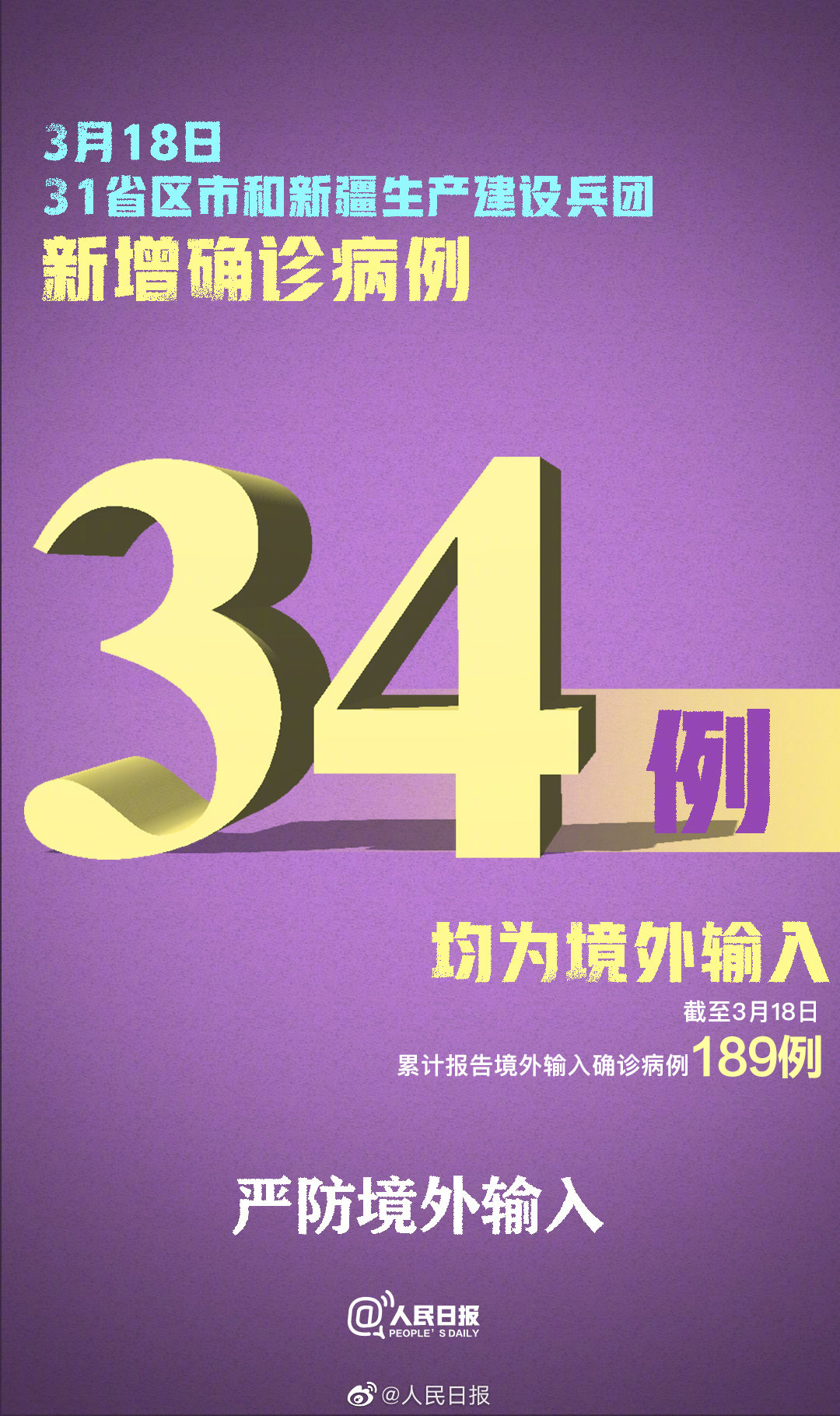 3月18日0—24时,新增报告境外输入确诊病例34例(北京21例,广东9例,上海2例,黑龙江1例,浙江1例)。截至3月18日24时,累计报告境外输入确诊病例189例。