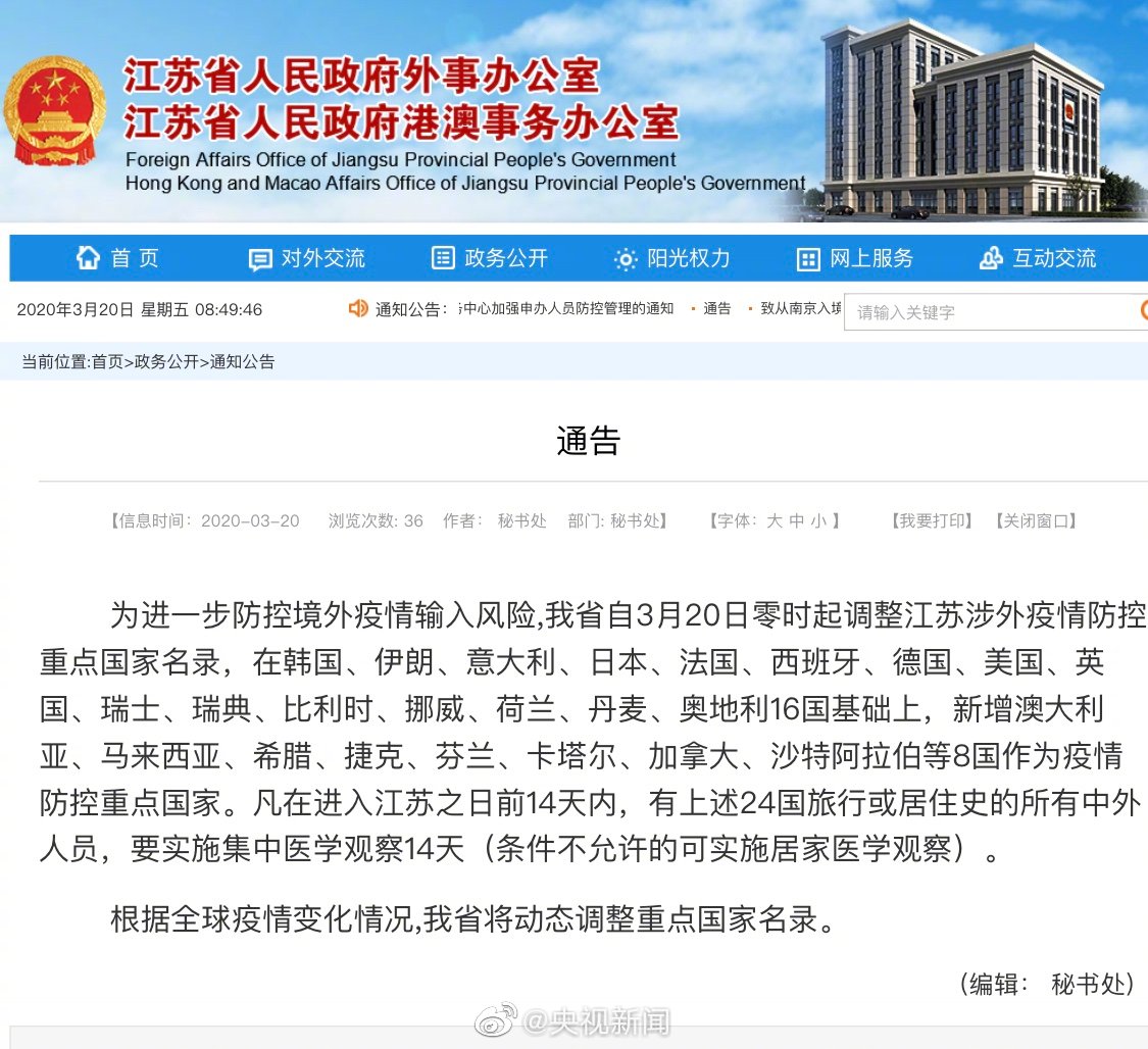 江苏自3月20日零时起调整江苏涉外疫情防控重点国家名录,在韩国、伊朗、意大利、日本、法国、西班牙、德国、美国、英国、瑞士、瑞典、比利时、挪威、荷兰、丹麦、奥地利16国基础上,新增澳大利亚、马来西亚、希腊、捷克、芬兰、卡塔尔、加拿大、沙特阿拉伯等8国作为疫情防控重点国家。凡在进入江苏之日前14天内,有上述24国旅行或居住史的所有中外人员,要实施集中医学观察14天(条件不允许的可实施居家医学观察)。(总台央视记者杨光)