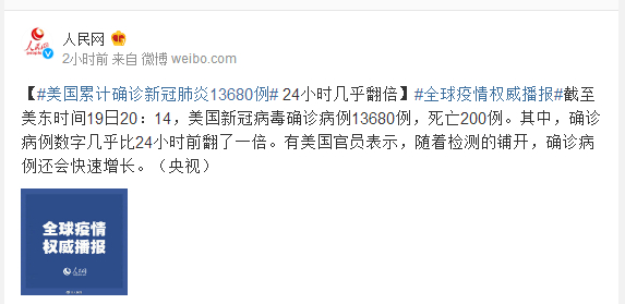 #全球疫情权威播报#截至美东时间19日20:14,美国新冠病毒确诊病例13680例,死亡200例。其中,确诊病例数字几乎比24小时前翻了一倍。有美国官员表示,随着检测的铺开,确诊病例还会快速增长。(央视)
