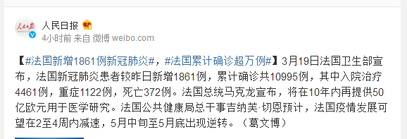 3月19日法国卫生部宣布,法国新冠肺炎患者较昨日新增1861例,累计确诊共10995例,其中入院治疗4461例,重症1122例,死亡372例。法国总统马克龙宣布,将在10年内再提供50亿欧元用于医学研究。法国公共健康局总干事吉纳芙·切恩预计,法国疫情发展可望在2至4周内减速,5月中旬至5月底出现逆转。(葛文博)