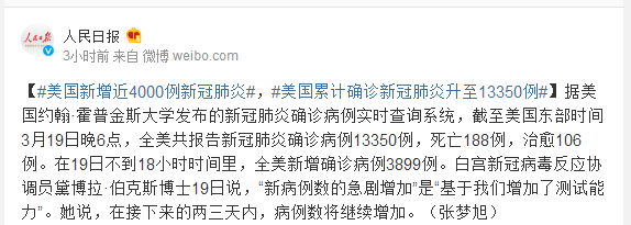 据美国约翰·霍普金斯大学发布的新冠肺炎确诊病例实时查询系统,截至美国东部时间3月19日晚6点,全美共报告新冠肺炎确诊病例13350例,死亡188例,治愈106例。在19日不到18小时时间里,全美新增确诊病例3899例。白宫新冠病毒反应协调员黛博拉·伯克斯博士19日说,“新病例数的急剧增加”是“基于我们增加了测试能力”。她说,在接下来的两三天内,病例数将继续增加。(张梦旭)
