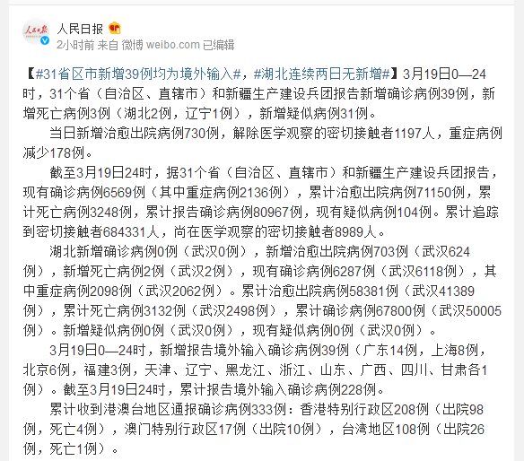 3月19日0—24时,31个省(自治区、直辖市)和新疆生产建设兵团报告新增确诊病例39例,新增死亡病例3例(湖北2例,辽宁1例),新增疑似病例31例。