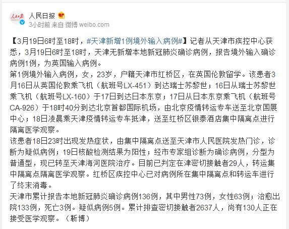 第1例境外输入病例,女,23岁,户籍天津市红桥区,在英国伦敦留学。该患者3月16日从英国伦敦乘飞机(航班号LX-451)到达瑞士苏黎世;16日从瑞士苏黎世乘飞机(航班号LX-160)于17日到达日本东京;17日从日本东京乘飞机(航班号CA-926)于18时40分到达北京首都国际机场,由北京疫情转运专车送至北京国展中心;18日凌晨乘天津疫情转运专车抵津,送至红桥区银泰酒店集中隔离点进行隔离医学观察。