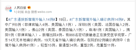 19日,#广东新增境外输入确诊病例14例#,其中广州5例(菲律宾输入4例、美国输入1例),深圳5例(英国、法国各输入2例、美国输入1例),佛山2例(英国、泰国各输入1例),珠海1例(英国输入),揭阳1例(菲律宾输入)。新增出院4例。有866名密切接触者正在接受医学观察。广东14天无本地确诊病例,19天无省外输入确诊病例。在院的62例确诊病例中(含境外输入病例41例),轻型15例,普通型34例,重型2例,危重型11例。