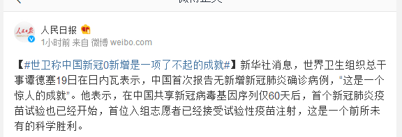 新华社消息,世界卫生组织总干事谭德塞19日在日内瓦表示,中国首次报告无新增新冠肺炎确诊病例,“这是一个惊人的成就”。他表示,在中国共享新冠病毒基因序列仅60天后,首个新冠肺炎疫苗试验也已经开始,首位入组志愿者已经接受试验性疫苗注射,这是一个前所未有的科学胜利。