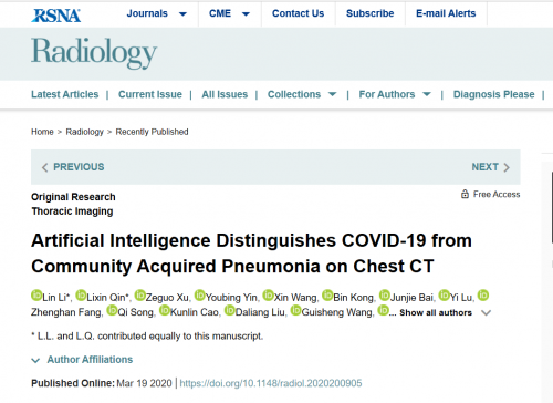 北京时间3月20日,科亚医疗的原创性研究成果:《Using Artificial Intelligence to Detect COVID-19 and Community Acquired Pneumonia based on Pulmonary CT: Evaluation of the Diagnostic Accuracy(基于肺CT的人工智能检测COVID-19和社区获得性肺炎:诊断准确性评估)》,作为“可以有效区分一般肺炎与新冠肺炎”的人工智能检测评估创新型技术,以其现实应用意义和研究前瞻性的价值。全球首个被国际顶级放射学期刊《Radiology》收录并发表。
