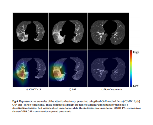 图2. COVNet做出决策的重要区域热图。a、b、c列分别展示了新冠肺炎、社区获得性肺炎、其他非肺炎数据的CT图(上)和可疑区域热图(下)