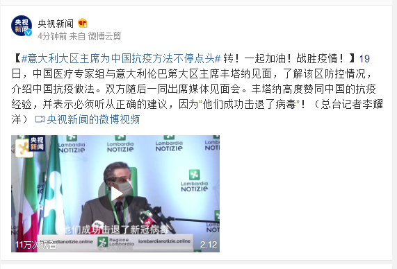 19日,中国医疗专家组与意大利伦巴第大区主席丰塔纳见面,了解该区防控情况,介绍中国抗疫做法。双方随后一同出席媒体见面会。丰塔纳高度赞同中国的抗疫经验,并表示必须听从正确的建议,因为“他们成功击退了病毒”!(总台记者李耀洋)