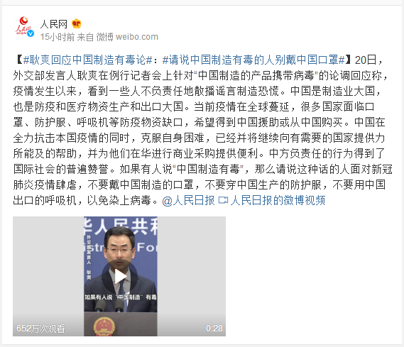 20日,外交部发言人耿爽在例行记者会上针对“中国制造的产品携带病毒”的论调回应称,疫情发生以来,看到一些人不负责任地散播谣言制造恐慌。中国是制造业大国,也是防疫和医疗物资生产和出口大国。当前疫情在全球蔓延,很多国家面临口罩、防护服、呼吸机等防疫物资缺口,希望得到中国援助或从中国购买。中国在全力抗击本国疫情的同时,克服自身困难,已经并将继续向有需要的国家提供力所能及的帮助,并为他们在华进行商业采购提供便利。中方负责任的行为得到了国际社会的普遍赞誉。如果有人说“中国制造有毒”,那么请说这种话的人面对新冠肺炎疫情肆虐,不要戴中国制造的口罩,不要穿中国生产的防护服,不要用中国出口的呼吸机,以免染上病毒。