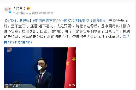 #中国已宣布向82个国家和国际组织提供援助#。无论“千里同好,坚于金石”,还是“道不远人,人无异国”,诗意表达背后,是中国涌泉相报的真心实意。检测试剂、口罩、防护服,哪个不是最实用的物资?口惠实至!援助的是物资,分享的是经验;深化的是合作,熔铸的是人类命运共同体意识。