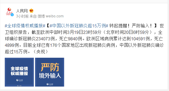 世卫组织报告,截至欧洲中部时间3月19日23时59分(北京时间20日6时59分),全球确诊新冠肺炎234073例,死亡9840例。欧洲区域病例累计达到104591例,死亡4899例。目前全球已有176个国家地区出现新冠肺炎病例,中国以外新冠肺炎确诊超过15万例。(央视)
