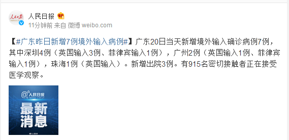 广东20日当天新增境外输入确诊病例7例,其中深圳4例(英国输入3例、菲律宾输入1例),广州2例(英国输入1例、菲律宾输入1例),珠海1例(英国输入)。新增出院3例。有915名密切接触者正在接受医学观察。