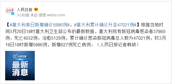 根据当地时间3月20日18时意大利卫生部公布的最新数据,意大利现有新冠病毒感染者37860例,死亡4032例,治愈5129例,累计确诊感染新冠病毒总人数为47021例,较3月19日18时新增5986例,新增627例死亡病例。(人民日报记者韩硕)