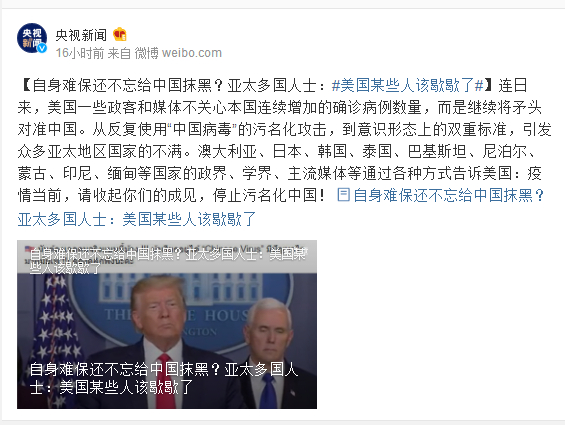 连日来,美国一些政客和媒体不关心本国连续增加的确诊病例数量,而是继续将矛头对准中国。从反复使用“中国病毒”的污名化攻击,到意识形态上的双重标准,引发众多亚太地区国家的不满。澳大利亚、日本、韩国、泰国、巴基斯坦、尼泊尔、蒙古、印尼、缅甸等国家的政界、学界、主流媒体等通过各种方式告诉美国:疫情当前,请收起你们的成见,停止污名化中国!