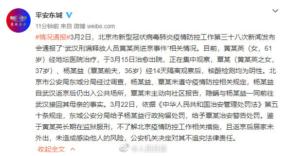 据@平安东城 :目前,黄某英(女,61岁)经地坛医院治疗,于3月15日治愈出院,正在集中观察,覃某(黄某英之女,37岁)、杨某益(覃某前夫,36岁)经14天隔离观察后,核酸检测均为阴性。北京市公安局东城分局经过调查,杨某益、覃某未遵守疫情防控相关规定,杨某益自武汉返京后仍出入公共场所,覃某未主动向社区报告,隐瞒与杨某益一同前往武汉接回其母亲的事实。3月22日,依据《中华人民共和国治安管理处罚法》第五十条规定,东城公安分局给予杨某益行政拘留处罚,给予覃某治安警告处罚。鉴于黄某英长期在监狱服刑,不了解北京疫情防控工作相关措施,且返京后居家未外出,未造成感染他人的风险,公安机关决定对其不追究法律责任。