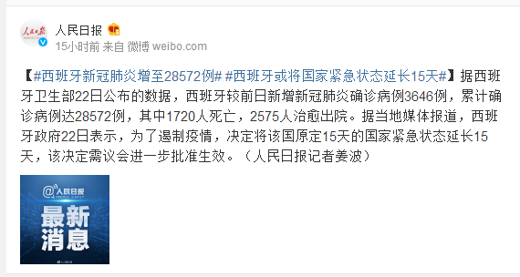 据西班牙卫生部22日公布的数据,西班牙较前日新增新冠肺炎确诊病例3646例,累计确诊病例达28572例,其中1720人死亡,2575人治愈出院。据当地媒体报道,西班牙政府22日表示,为了遏制疫情,决定将该国原定15天的国家紧急状态延长15天,该决定需议会进一步批准生效。(人民日报记者姜波)