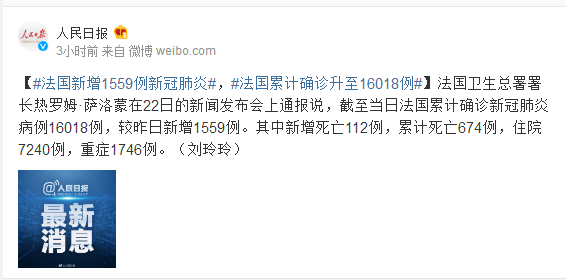 法国卫生总署署长热罗姆·萨洛蒙在22日的新闻发布会上通报说,截至当日法国累计确诊新冠肺炎病例16018例,较昨日新增1559例。其中新增死亡112例,累计死亡674例,住院7240例,重症1746例。(刘玲玲)