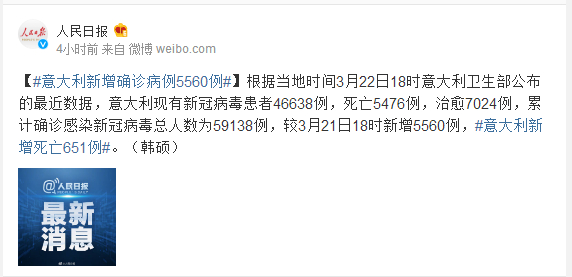 根据当地时间3月22日18时意大利卫生部公布的最近数据,意大利现有新冠病毒患者46638例,死亡5476例,治愈7024例,累计确诊感染新冠病毒总人数为59138例,较3月21日18时新增5560例,#意大利新增死亡651例#。(韩硕)