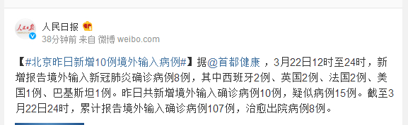 据@首都健康 ,3月22日12时至24时,新增报告境外输入新冠肺炎确诊病例8例,其中西班牙2例、英国2例、法国2例、美国1例、巴基斯坦1例。昨日共新增境外输入确诊病例10例,疑似病例15例。截至3月22日24时,累计报告境外输入确诊病例107例,治愈出院病例8例。