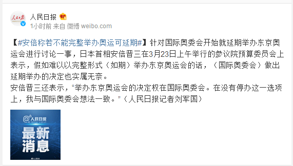 针对国际奥委会开始就延期举办东京奥运会进行讨论一事,日本首相安倍晋三在3月23日上午举行的参议院预算委员会上表示,假如难以以完整形式(如期)举办东京奥运会的话,(国际奥委会)做出延期举办的决定也实属无奈。