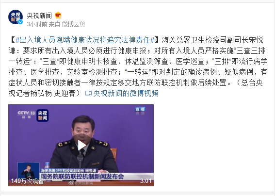 海关总署卫生检疫司副司长宋悦谦:要求所有出入境人员必须进行健康申报;对所有入境人员严格实施“三查三排一转运”:“三查”即健康申明卡核查、体温监测筛查、医学巡查;“三排”即流行病学排查、医学排查、实验室检测排查;“一转运”即对判定的确诊病例、疑似病例、有症状人员和密切接触者一律按规定移交地方联防联控机制做后续处置。(总台央视记者杨弘杨 史迎春)
