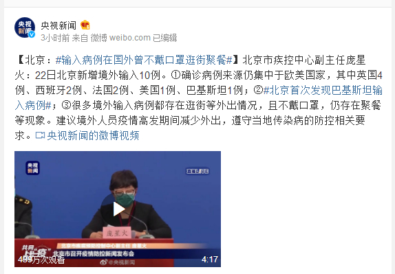 北京市疾控中心副主任庞星火:22日北京新增境外输入10例。①确诊病例来源仍集中于欧美国家,其中英国4例、西班牙2例、法国2例、美国1例、巴基斯坦1例;②#北京首次发现巴基斯坦输入病例#;③很多境外输入病例都存在逛街等外出情况,且不戴口罩,仍存在聚餐等现象。建议境外人员疫情高发期间减少外出,遵守当地传染病的防控相关要求。
