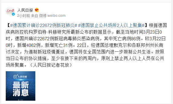根据德国疾病防控机构罗伯特·科赫研究所最新公布的数据显示,截至当地时间3月23日0时,德国共确诊22672例新冠病毒肺炎感染病例,其中死亡病例86例。较3月22日0时,新增4062例,新增死亡31例。22日,经德国总理默克尔和各联邦州州长商讨决定,为遏制新冠疫情蔓延,德国将在全国范围内进一步限制公共生活。按照当日公布的协议措施,至少在接下来的两周内,原则上禁止两人以上人员在公共场所聚集。(人民日报记者花放)