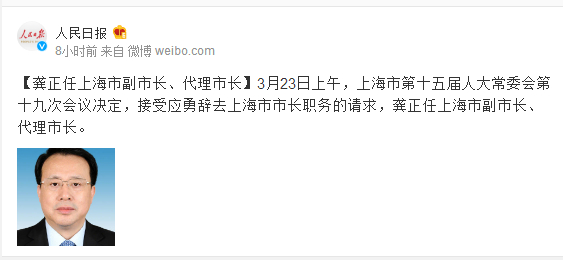 3月23日上午,上海市第十五届人大常委会第十九次会议决定,接受应勇辞去上海市市长职务的请求,龚正任上海市副市长、代理市长。