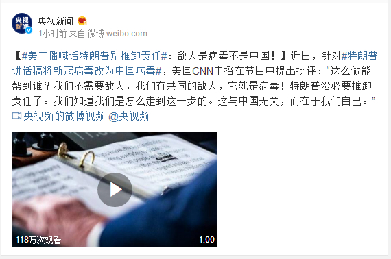 近日,针对#特朗普讲话稿将新冠病毒改为中国病毒#,美国CNN主播在节目中提出批评:“这么做能帮到谁?我们不需要敌人,我们有共同的敌人,它就是病毒!特朗普没必要推卸责任了。我们知道我们是怎么走到这一步的。这与中国无关,而在于我们自己。”