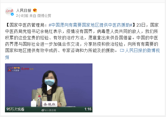 23日,国家中医药局党组书记余艳红表示,疫情没有国界,病毒是人类共同的敌人,我们所积累的这些宝贵的经验、有效的治疗方法,愿意拿出来供各国借鉴。中国的中医药界愿与国际社会进一步加强合作交流,分享防疫和救治经验,向所有有需要的国家和地区提供有效中成药、专家咨询和力所能及的援助。