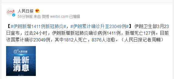 伊朗卫生部3月23日宣布,过去24小时,伊朗新增新冠肺炎确诊病例1411例,新增死亡127例。目前该国累计确诊23049例,其中1812人死亡,8376人治愈。(人民日报记者周輖)