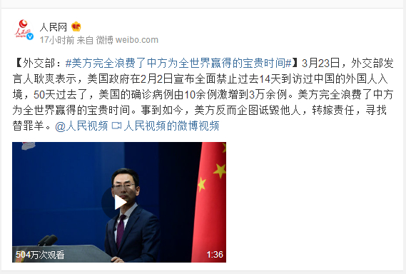 3月23日,外交部发言人耿爽表示,美国政府在2月2日宣布全面禁止过去14天到访过中国的外国人入境,50天过去了,美国的确诊病例由10余例激增到3万余例。美方完全浪费了中方为全世界赢得的宝贵时间。事到如今,美方反而企图诋毁他人,转嫁责任,寻找替罪羊。